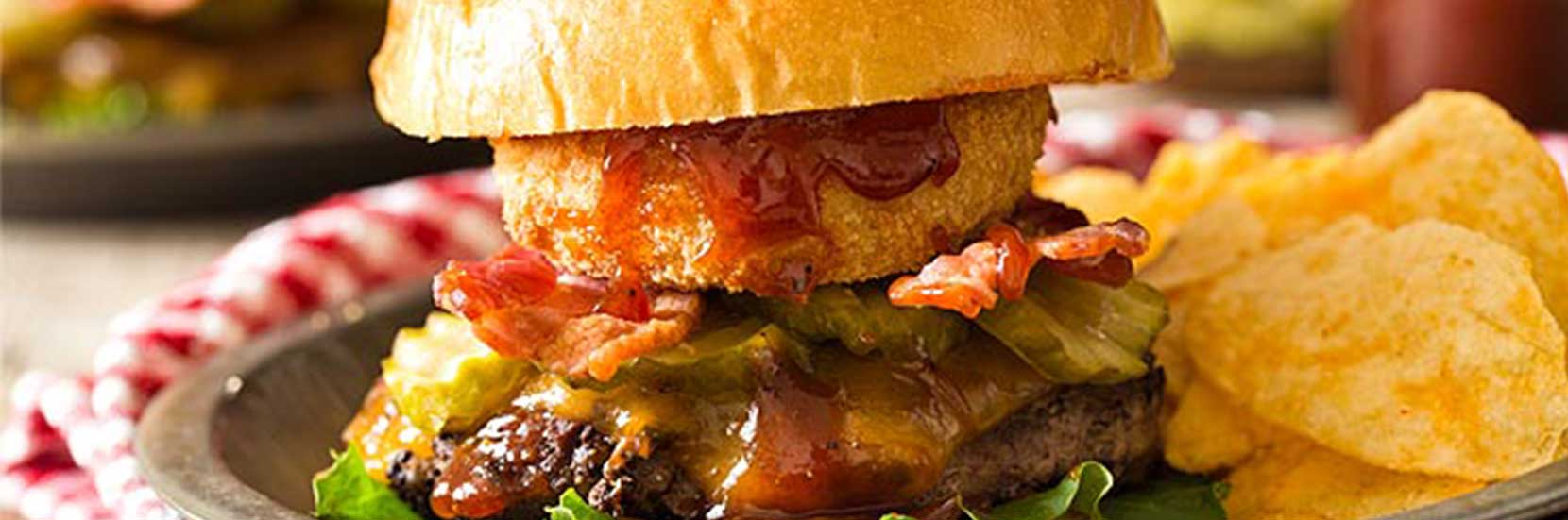 Spread a little – or a lot – of BBQ sauce on the bottom bun. Add lettuce, the cheesy Angus BUBBA burger, crispy bacon, tomato slices, pickles, and a crunchy onion ring. Drizzle a little more BBQ sauce on top and add the top bun. Serve it up with the leftover onion rings on the side and enjoy! Warning: you may get messy but it will be worth it.