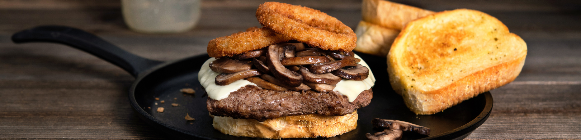 Once your Texas toast is cool enough to touch, begin to assemble your burger! Place your seared Angus BUBBA burgers on one slice of toast, followed by a spoonful of mushrooms, a couple of crispy onion rings, and the top piece of Texas toast. Serve with your favorite sides and enjoy!